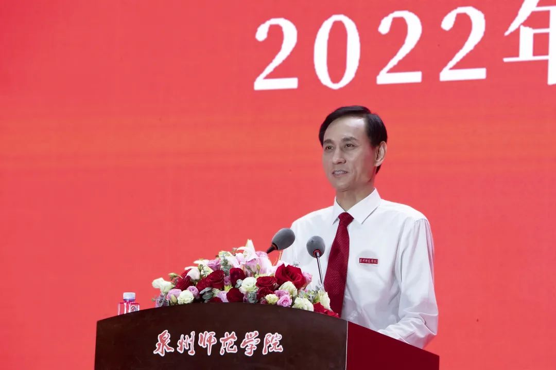 校长屈广清在致辞中祝贺2022届毕业生,并向培养和关心毕业生成长成才的师长、亲人和社会各界致以最诚挚的感谢和最崇高的敬意。他列举了本届毕业生在竞赛、考研等方面取得的成绩,回顾了四年来学校建设发展取得的成就以及泉州新冠肺炎疫情期间师生共同抗疫的点滴。屈广清以“行远自迩再出发 笃行不怠赢未来”为主题,用叶宏坚、吴季怀和蔡崇达三位学长的成长经历勉励毕业生:一要初心如磐、赓续前行。无论什么职业,无论处在何方,要不忘初心,永葆本色。二要砥砺深耕、履践致远。专注内心的热爱,默默坚守,倾力钻研,久久为功,终能抵达理想的未来。三要奋楫笃行、扬帆筑梦。立足人生主赛场,不断探索,开启一个个时间“盲盒”,抢占“快车道”,跑出“加速度”。