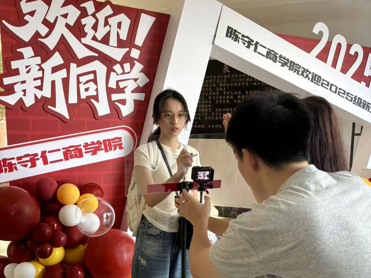 学院以“山河潮声启新程,烽火精神砺初心”为主题,融合思政教育,结合学院校侨联合办学特色和守仁商道,开展特色迎新活动。在报到处设置“创意打卡点”“镜头签”“守仁商道”等主题区域,新生可与打卡点合影留念,感受学院深厚文化底蕴。